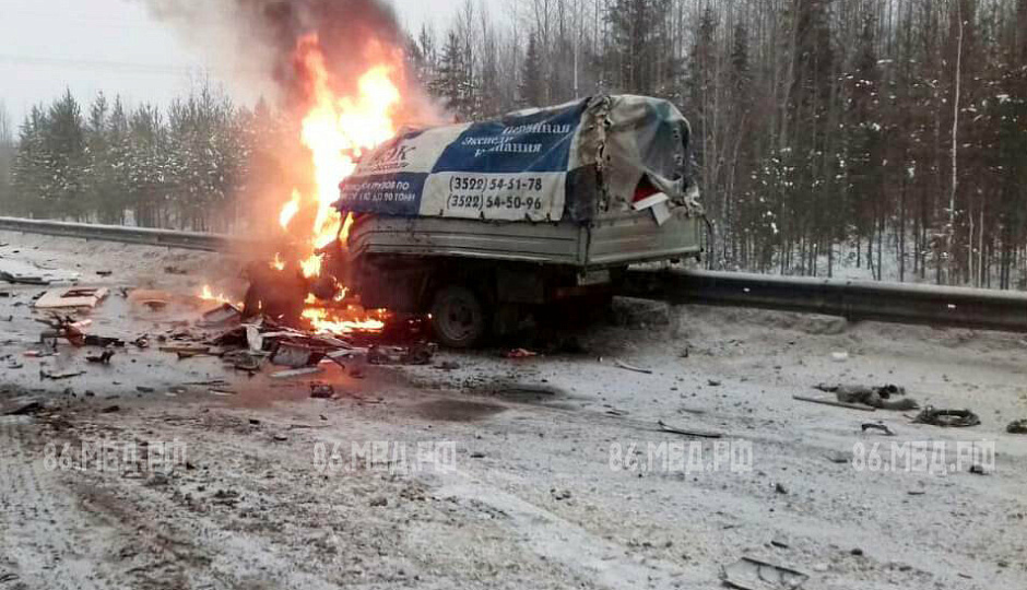 По предварительным данным столкнулись 3 автомобиля – Хендай Солярис, Газель и вахтовка. В результате возгорания Газели погиб водитель. Еще 4 человека получили травмы.