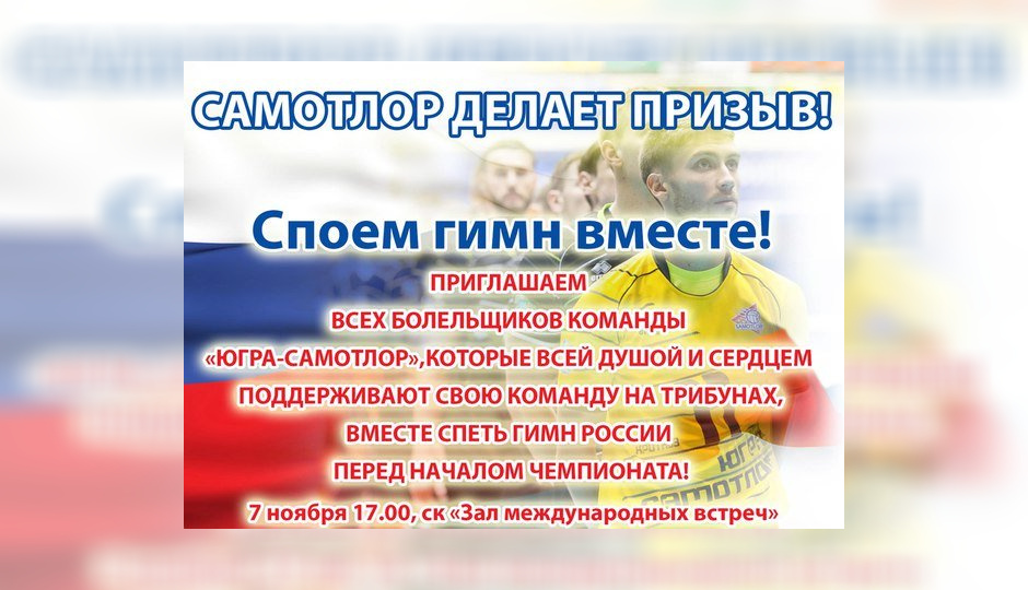 В окружении сотни человек, дружно, хором спеть гимн Российской Федерации приглашает всех желающих «Югра – Самотлор». Перед началом чемпионата, болельщикам, неравнодушным к судьбе команды вартовчанам и просто любителя громко петь предлагается вместе исполнить гимн нашей страны. 7 ноября в 17.00 в зале международных встреч. Для тех, кто подзабыл слова, ниже есть шпаргалка. Споем гимн вместе!