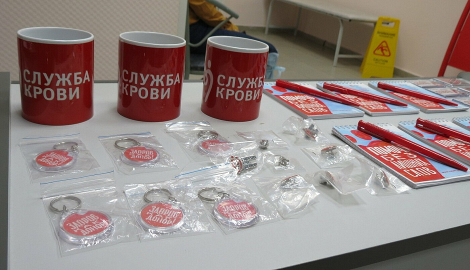Безвозмездным донорам, участвующим в акции, вручают приятные подарки - сувенирную продукцию с символикой Службы крови.