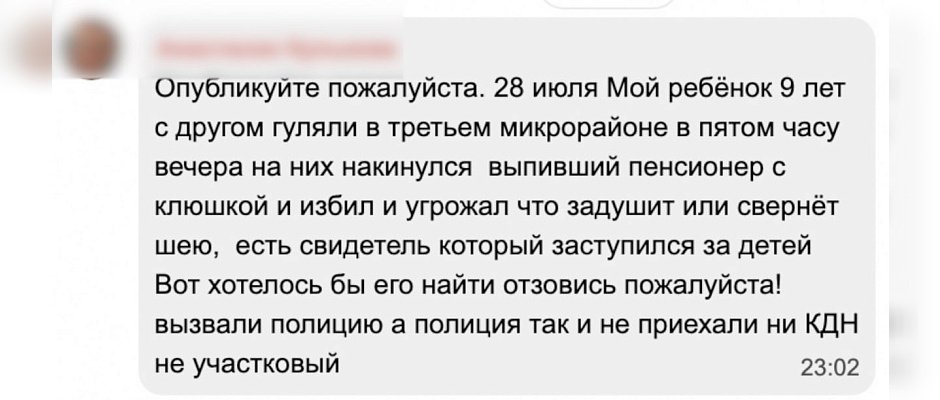 "Мой ребенок 9 лет с другом гуляли в третьем микрорайоне в пятом часу вечера. На них накинулся выпивший пенсионер с клюшкой и избил, и угрожал, что задушит или свернет шею", - сказано в скриншоте сообщения местной жительницы, который опубликован в соцсети.