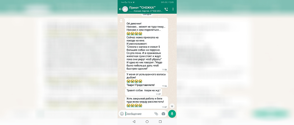 "Лежат 5 больших собак на перроне с пеной во рту. Сотрудники жд-вокзала в Нижневартовске в оранжевых жилетках стоят и ждут, когда собаки умрут. И одна из них говорит: надо было побольше дать, чтобы быстрее сдохли", - приводит девушка слова мамы, которая на поезде приехала в Нижневартовск из Уфы.